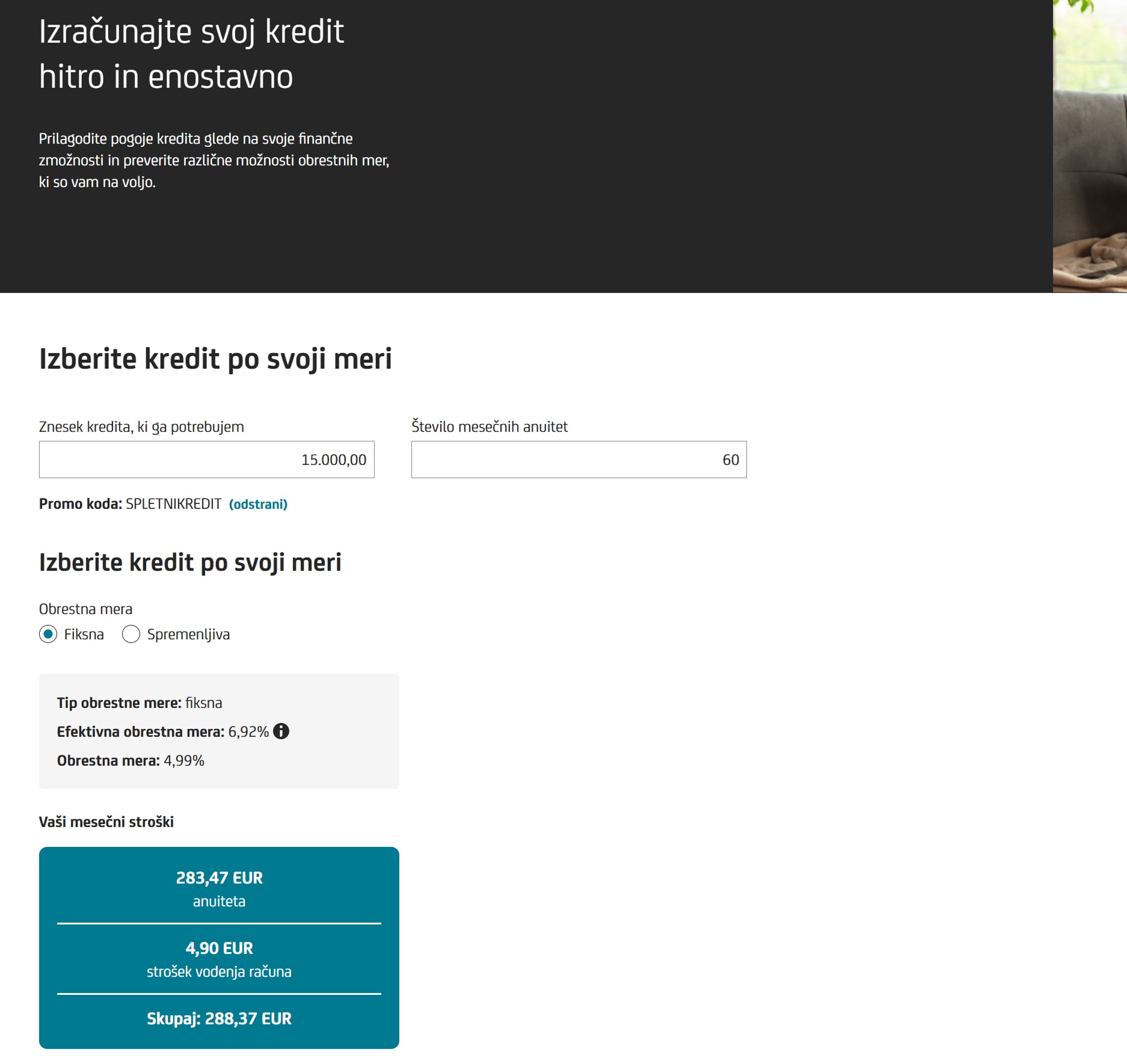 Z nadaljevanjem postopka se vam odpre stran s podatki izbranega kredita. Pred oddajo vloge lahko svoj izbrani kredit še spremenite, prav tako pa se vam na strani odpre možnost vpisa promocijske kode, za mogoč dostop do dodatnih ugodnosti ob oddaji vloge za kredit.