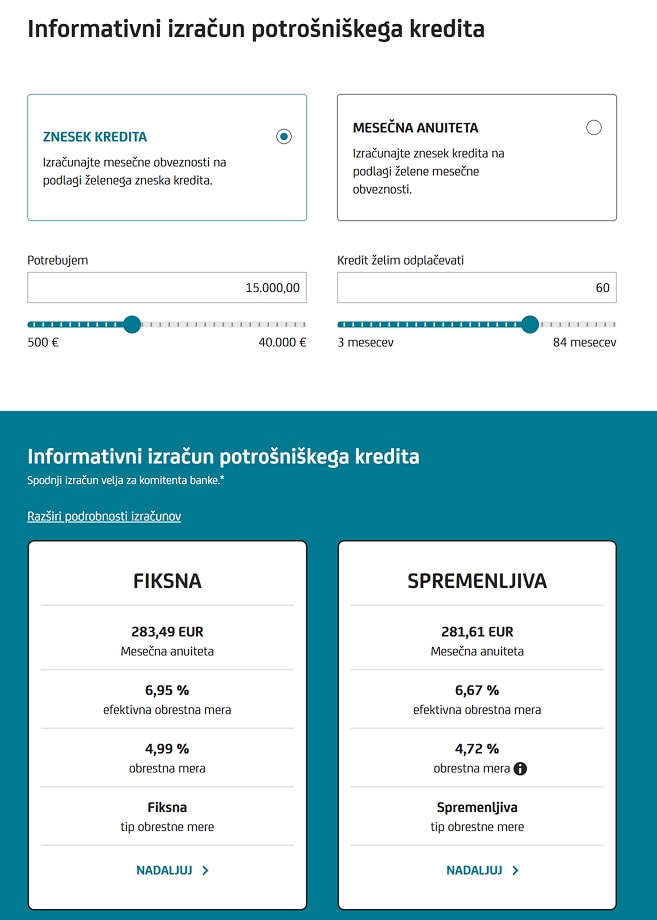 Po pregledu informativnega izračuna lahko izberete možnost "Nadaljuj kot komitent" in začnete z izpolnevanjem vloge v Online poslovanju ali pa se naročite na sestanek v vam najbližji enoti.