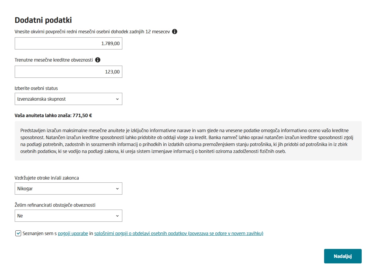 Pred nadaljevanjem z informativnim izračunom izpolnite še zahtevane podatke v razdelku "Dodatni podatki" in sicer navedite:
