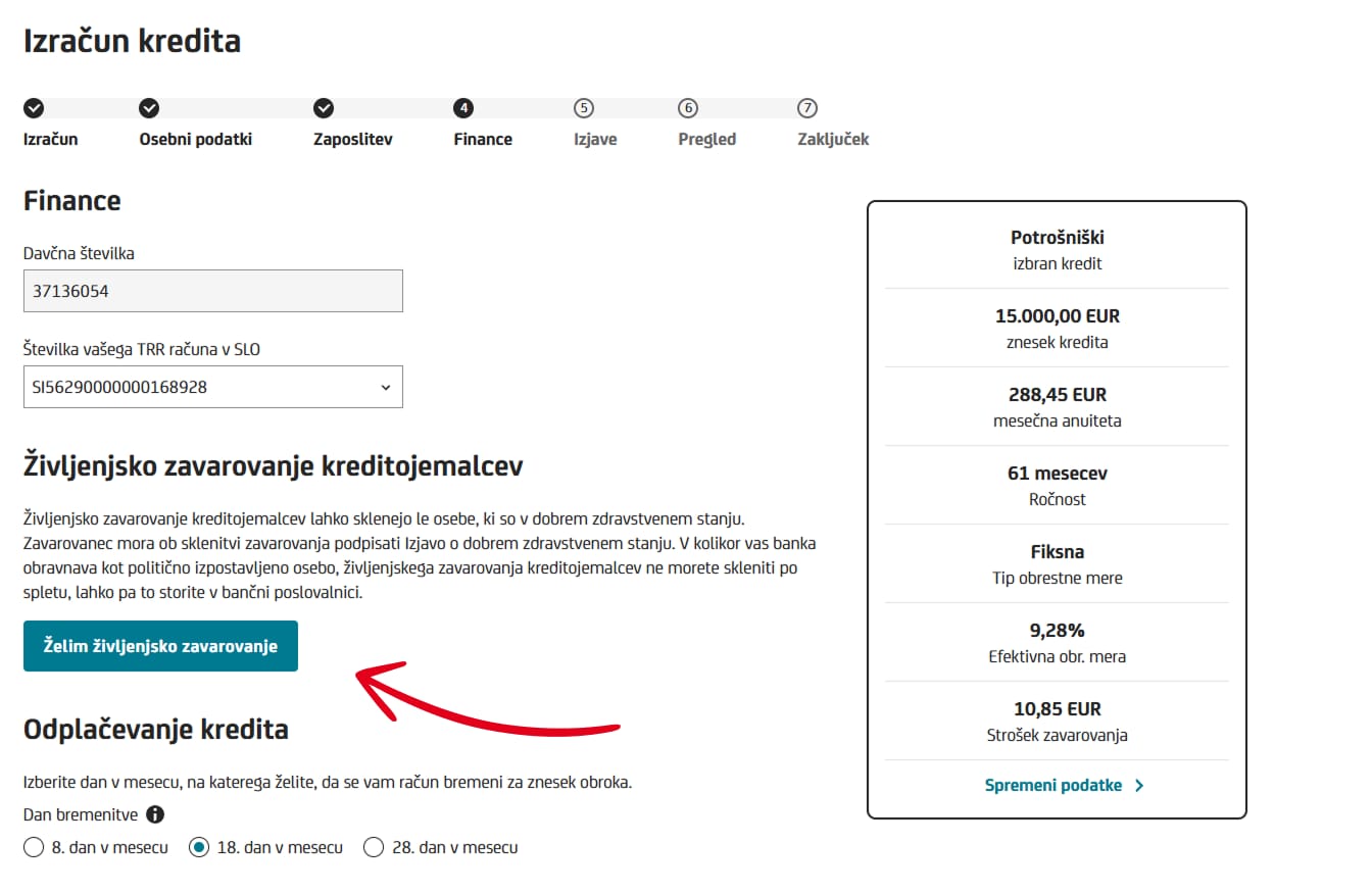 Na zavihku Finance vam je ob oddaji vloge na voljo tudi možnost sklenitve življenskega zavarovanja.