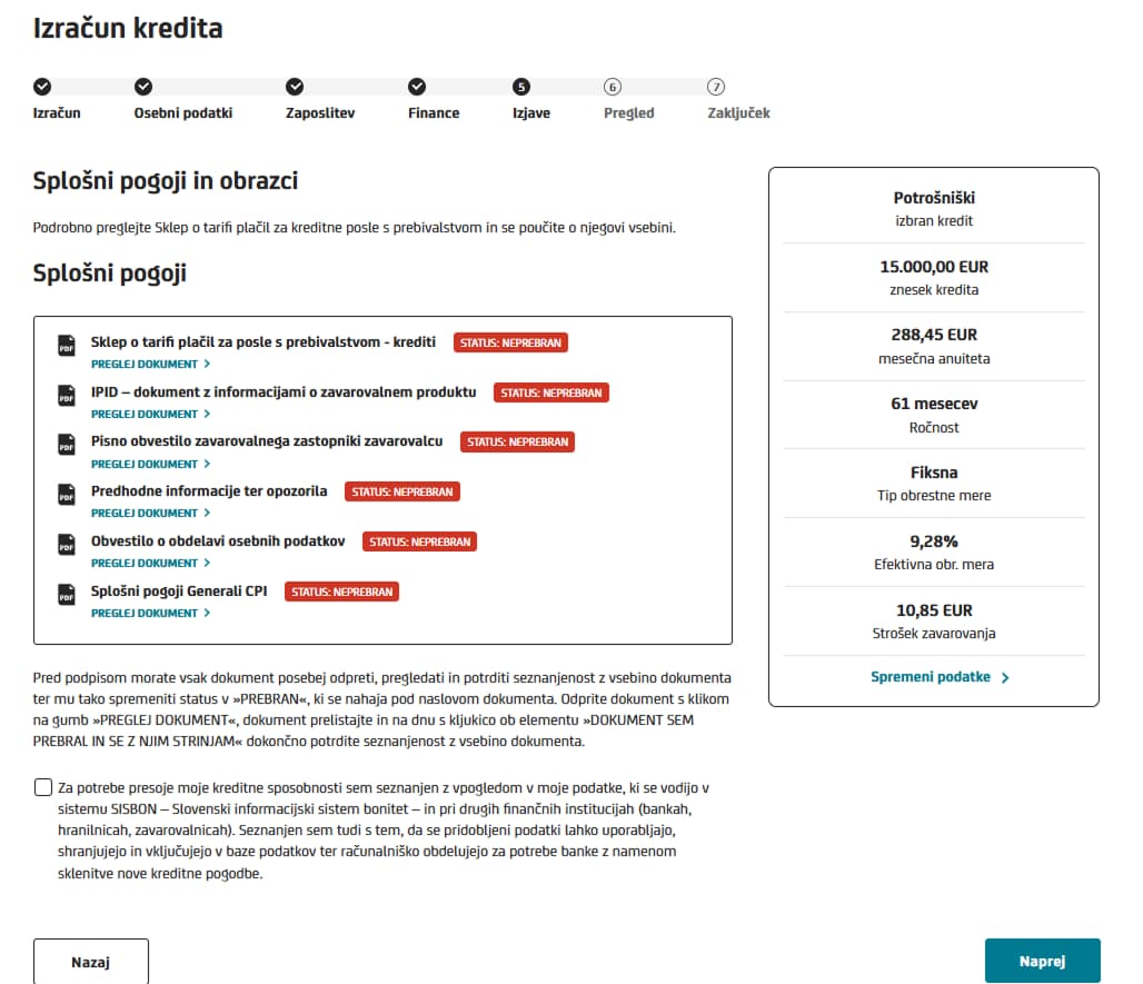Pred oddajo vloge za potrošniški kredit je potrebno pregled in potrditev pregleda priložene dokumentacije. Za pregled in potrditev seznanjenosti odprite posamezni dokument ter na dnu dokumenta izberite "Dokument sem prebral in se z njim strinjam". V nasprotnem primeru oddaja ne bo mogoča.