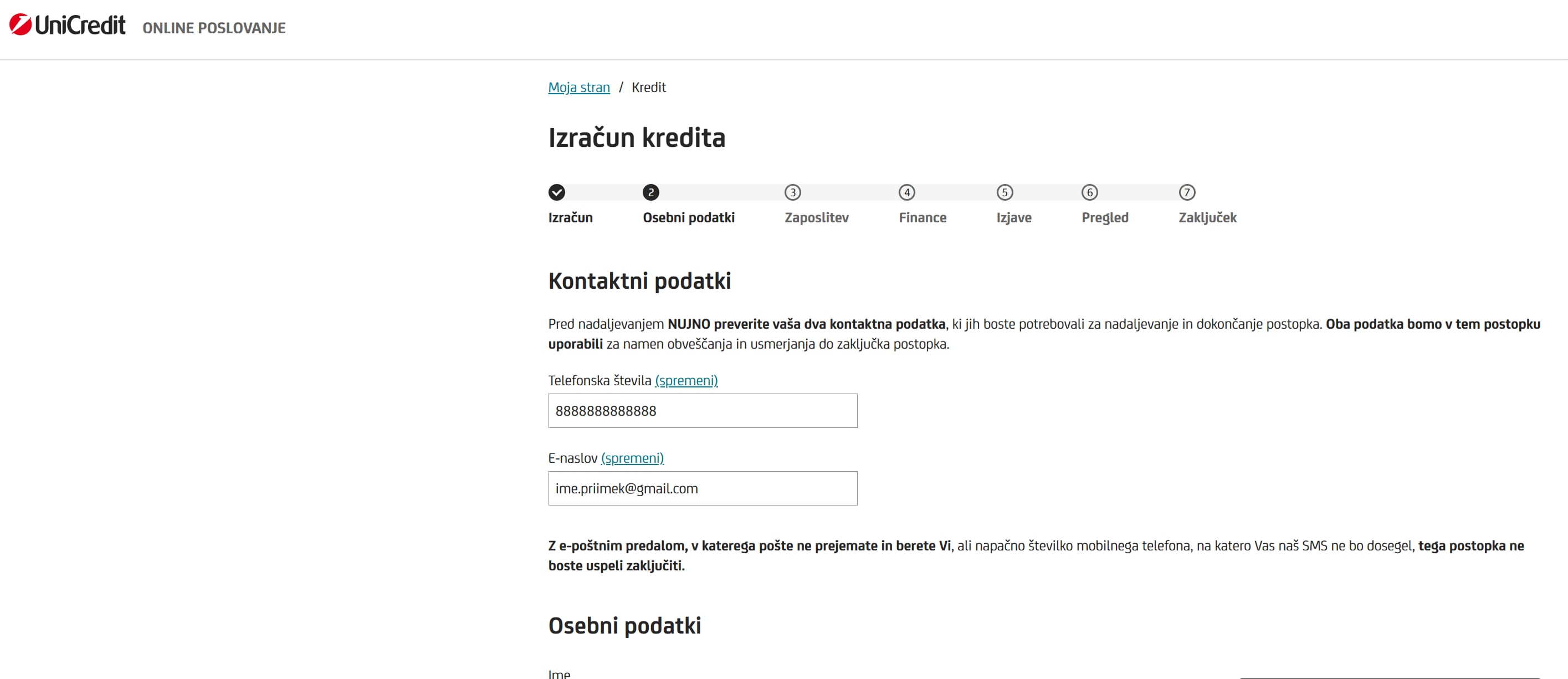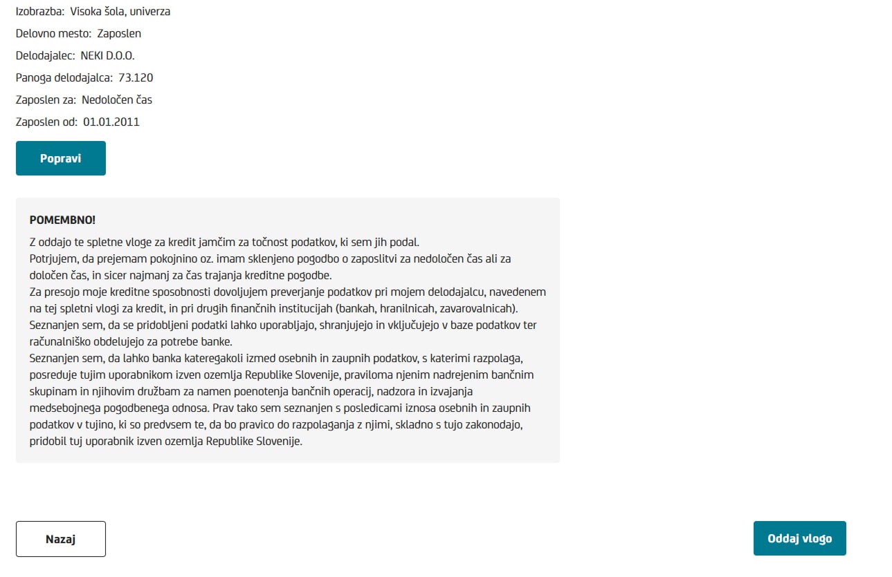 Pred oddajo vloge prosimo preverite vse navedene podatke na vaši kreditini vlogi. V kolikor so podatki pravilni, lahko vlogo oddate. V nasprotnem primeru se lahko vrnete na korak vloge, kjer je potrebno podatke spremeniti ter uredite spremembo.