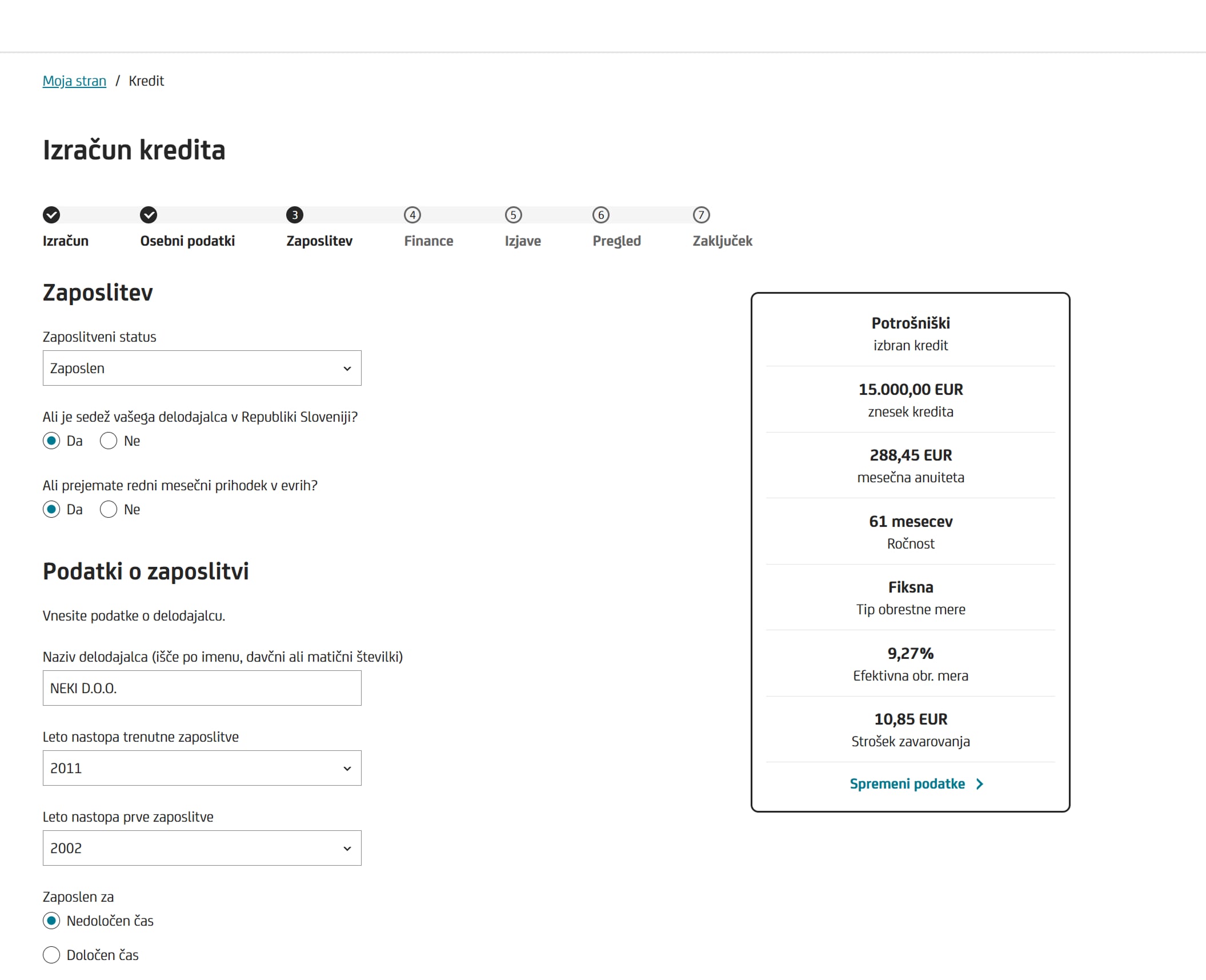Za uspšeno oddajo vloge za potrošniški gotovinski kredit, prosimo natačno izpolnite podatke o vaši zaposlitvi in vaše finančne podatke.